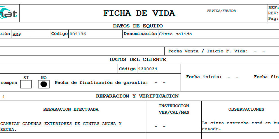 Solución: Creamos una ficha de vida para cada equipo que mantenemos. En ella introducimos todas las reparaciones efectuadas, los mantenimientos preventivos, materiales y horas empleadas, con su fecha insertada dentro de una base de datos electrónica… Esta ficha de vida se pone a disposición de nuestros clientes para que puedan conocer con todo detalle el estado de los equipos.
